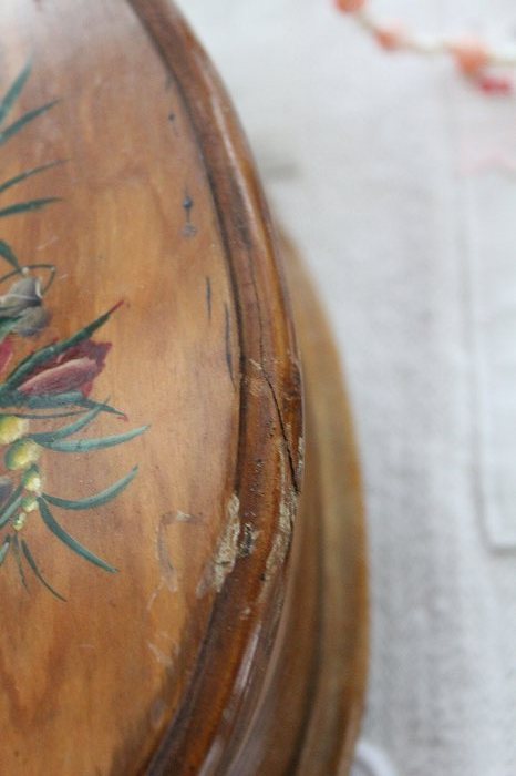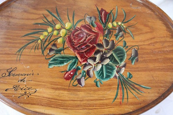 蓋の表面にハンドペイントの薔薇とミモザとスミレの花束が描かれた
