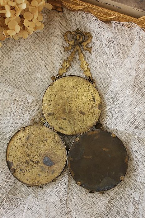 1880-1890 フランス製 ブロンズのリボンとローズガーランドのレリーフが施されたとても珍しい3連のフォトフレームです。 フレーム内には古いポートレート写真が収められています。 全てオリジナルの状態です。 後方には壁掛け用のルーフが設置されています。