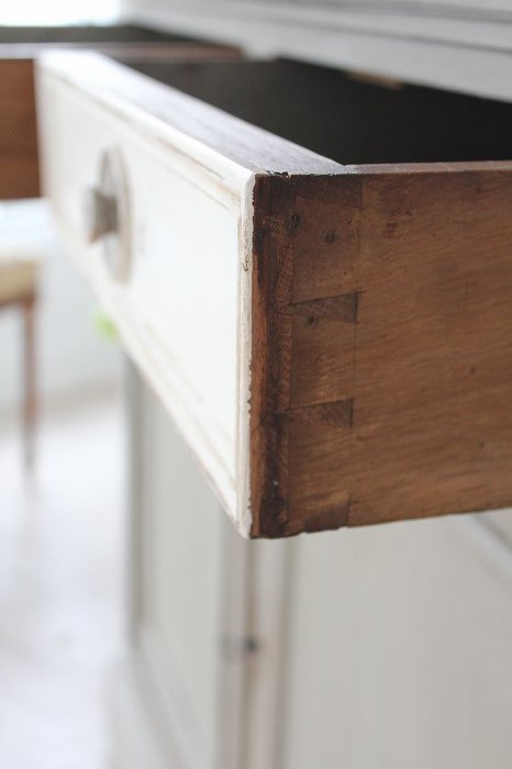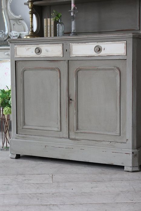 全体にグレーのペイントが施され、装飾部分と抽斗のフロント部分は