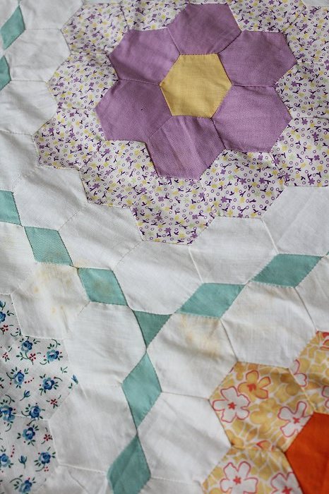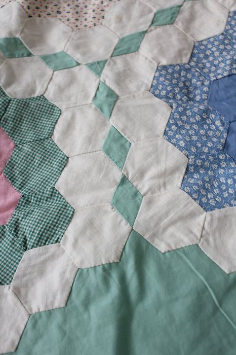 キルトトップの裏側を見ると、たいへん細やかなハンドピーシングの針目が確認できます。