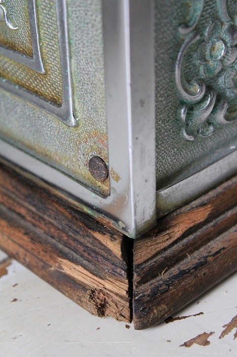 木製の土台、向かって右側奥くの角に小さなカケがみられます。