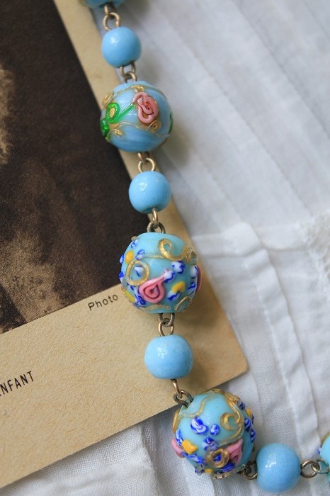 1930-1950年代頃 可愛らしい水色のガラスビーズにピンクやブルーのお花とグリーンと金彩で全体に模様が施された 「ウェディングケーキ」と呼ばれるハンドメイドのガラスビーズのネックレスです。 全てオリジナルです。留め金の状態も良好です。 ブラウスやTシャツに合わせたり、レースのお洋服にもピッタリです♪
