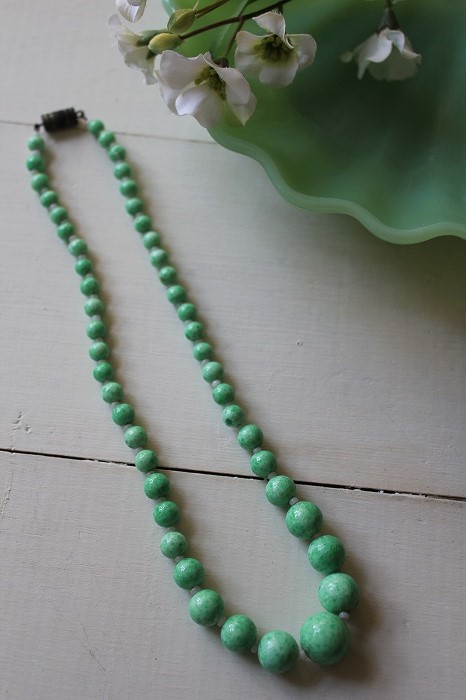 可愛らしいグリーンマーブルのガラスビーズとオパーリンガラスの小さなビーズのネックレスです。 目立つダメージも無く、良いコンディションです。 留め金の状態も良好です。 ブラウスやTシャツ、レースのワンピースなど、どのような装いにもピッタリです。