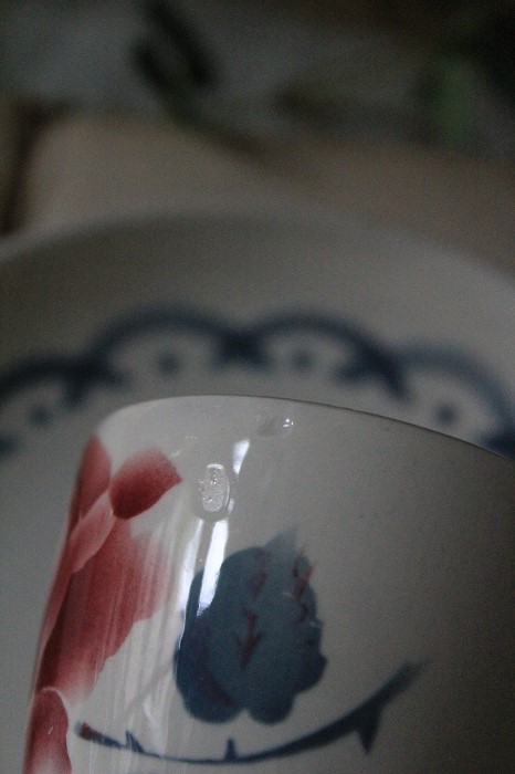 ディゴアンサルグミンヌ窯 CANNES(カンヌ)シリーズの カップ&ソーサーです。 薔薇とブルーのスカラップにドット模様のステンシルがカップとソーサーに施されています。 製造時からのステンシルの乱れや土の付着など見られますが、 ヒビやカケなどは無く、全体に良いコンディションです。
