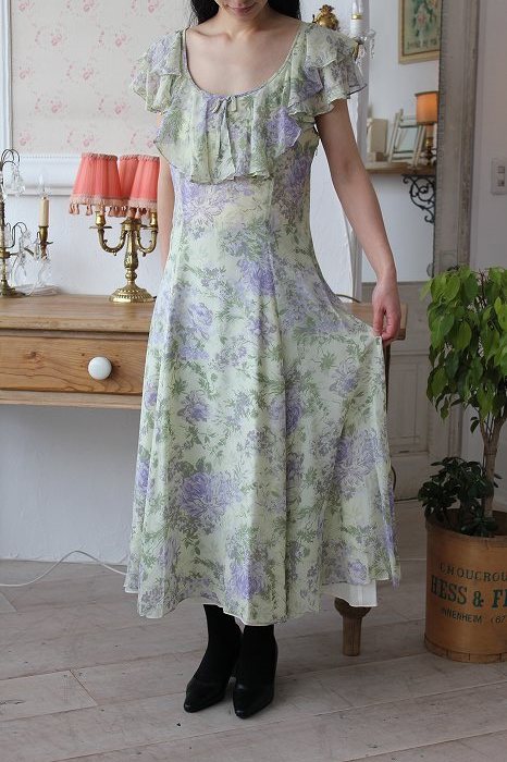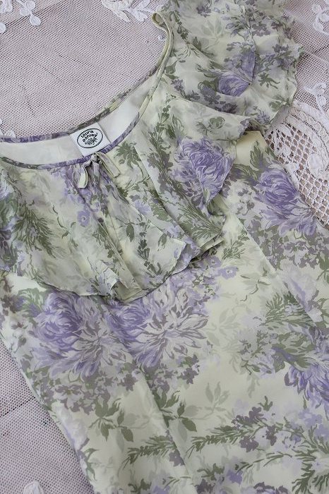 'ローラアシュレイの美しいシルクのドレスです。 とても軽く、サラッとした着心地です。 裏地が付いていますので、透け感はありません。 解れや破れ、ホールなども無く、全体に良いコンディションです。 サイズ11号〜13号 着丈108cm 身幅46cm 裾幅135cm 素材:表地シルク100% 裏地アセテート100% カラー:淡いクリーム色のベースに青紫色のお花とグリーンの葉のプリント モデル身長 165cm