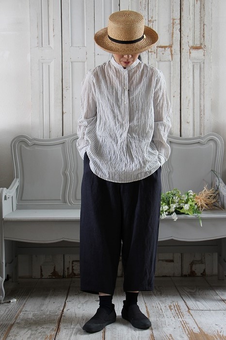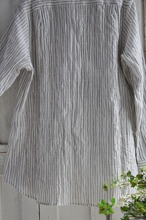 オーガニックコットンを使用した、ナチュラルな風合いのシャーリングストライプです。 オフホワイトにネイビーのストライプがとてもさわやかな印象です。 薄く、軽く、ふくらみと柔らかさを兼ね備えた肌触りの良い生地で作られたプルオーバーです。 素材:綿99% ポリウレタン1% カラー:オフホワイト×ネイビーストライプ サイズフリー:着丈76cm、身幅54cm 備考:日本製