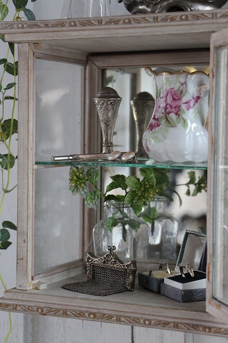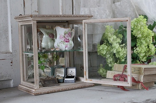 とてもチャーミングなディスプレーキャビネットです。 壁に掛けても、カウンターに置いても使える小さなキャビネット。 バックサイドにミラーが設置されてあり、ドアと両サイドはガラス張りとなっていますので、 ディスプレーしたものが明るく、美しく見えます。 ジュエリーケースにもお薦めです。アンティークのドールファニチャーや、 シルバーの小物など、小さな宝物のディスプレイにいかがでしょうか。 どのようなものを飾っても素敵に見せてくれるキャビネットです。 中々見つからない小ぶりサイズです。