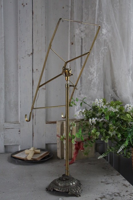 フランスのテーラーで使われていたシャツスタンドです。 バーのサイドに付いているレバーで高さ調節が可能です。 また、ラックの付け根部分がブラスのボールになっていますので、 角度調整や回転も自在です。 撮影時には本を置いてみました。 安定感もありますので、リーディングスタンドとしてもお薦めです。