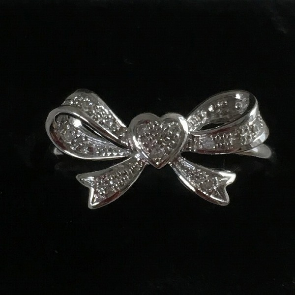 ダイヤモンドが敷き詰められたリボンの形が可愛らしいホワイトゴールドリングです。 繊細なゴールド細工にはめ込まれた小さなダイヤモンドが 指の動きと共にキラキラと輝く美しいリングです。 細やかに打ち込まれたミルに合せてはめ込まれた天然ダイヤモンドは約0.1カラットとなります。 シャンクに9ct ゴールドUK Londonのホールマークが入っています。 いつもよりお洒落した日の装いにピッタリです。