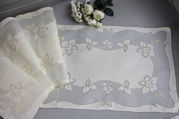 フランスアンティーク パリッとしたオーガンジーに明るいクリーム色のリネンでお花型のアップリケが可愛らしい プレイスマット4枚セットです。 全てハンドメイドとなります。 特に目立つ解れやホールなども無く全体に良いコンディションですが、 一枚だけ小さな点のようなシミが見られます。 (画像にてご確認下さい)