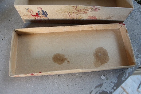 Souvenir d’Avignon Chaussures Ms Cazotとエンボスで店名が施された プロヴァンスの中心、アヴィニヨンにかつてお店があったと思われる美しい履物用の布箱です。 どのような履物が入っていたのでしょうか。。。 蓋に施されたエンボスの美しい文字とプリントに見入ってしまいます。 全体に薄いシミや蓋のエッジに亀裂など見られますが、箱そのものはしっかりとした良いコンディションです。