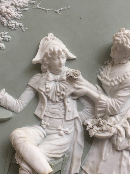 ウェッジウッド社のジャスパーのような釉薬をかけず仕上げられたビスクのプラークです。 おそらく1800年代のものと思われる大変古いものとなります。 ナポレオンハットをかぶった軍人と花売り婦人のレリーフは細部まで大変繊細に 作られています。 残念ながら軍人の足が欠損しています。 また婦人の首は接着された跡が見られます。 それ以外にも、まったく目立ちませんが、左側のフレームのエッジに欠損が見られます。 状態に合わせてお値段をお安くさせて頂きました。