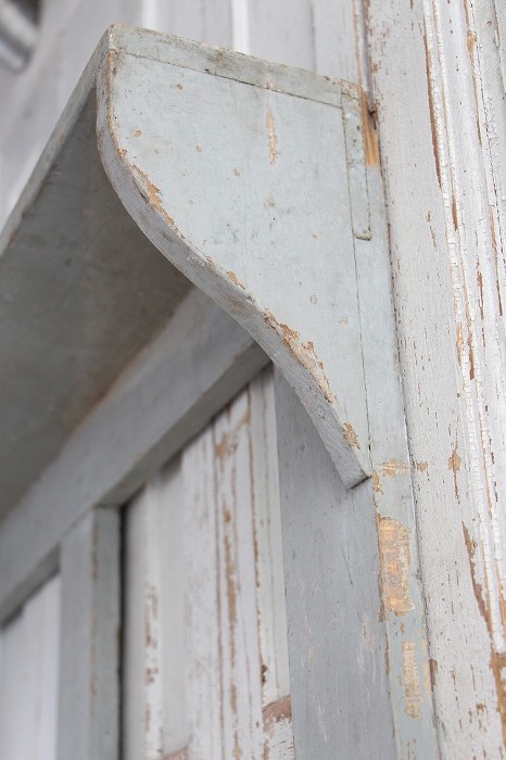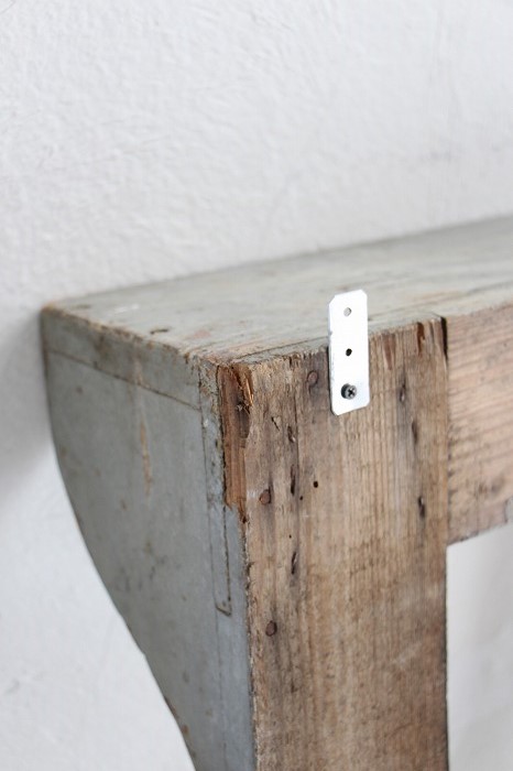 アイディア次第で、いろいろと楽しめる味わいのあるハンドメイドのウォールシェルフです。 買い付けた時にはドライフラワーの大きなリースを掛けてディスプレーされていました。 L字フックが二つ設置されていましたので、そのままお付けします。 お好きな場所にフックを付け足してお使い下さい。 お庭ではガーデン用具などを掛けたり、台所ではキッチンツール掛けにしたり。。。 シャビーシックな雰囲気漂う、あると便利なウォールシェルフです。 フック穴があちらこちらに空いています。 ペイントはオリジナルとなります。