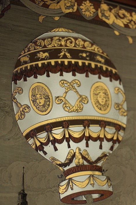 細やかで美しい気球の模様。ヘッダー部分の二人のエンジェル。フッダー両サイドのイーグル。