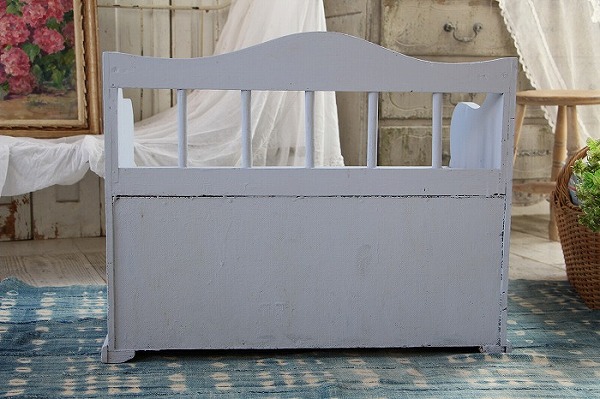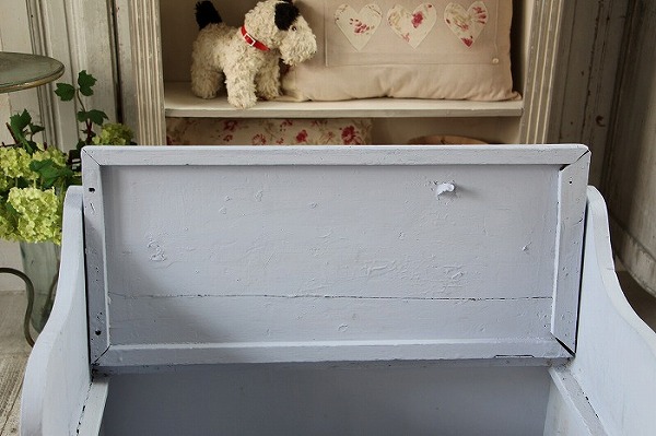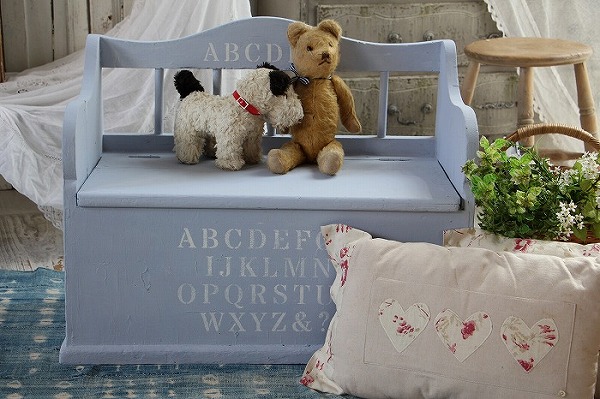 1930年代デンマーク製のハンドメイドの可愛らしいベンチタイプの収納ボックスです。 お子様用のベンチを兼ねたおもちゃ箱でしょうか。 分厚くしっかりとした木材で作られています。 ベンチは50キロ前後の大人が二人座ってもびくりともしません!! とても丈夫です。 蓋の開閉もスムーズですし、収納力もタップリです。 ステンシルが施されたペイントも可愛いです。 ところどころ分厚い木材特有の亀裂などがみられます。(画像にてご確認下さい) 子供服などのショップ用ディスプレーにお勧めです。