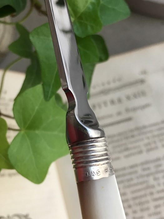 神秘的な深い輝くを放つMOPのふっくらとした美しいハンドルのレターオープナーです。 ナイフの根元には1911年のシェフィールドの刻印と シルバースミスJAS(James A Scholes 製造)が入っています。 とてもスタイリッシュな雰囲気です。 切れ味良好です。 重量40グラム