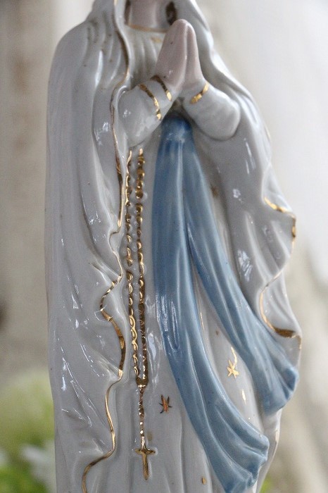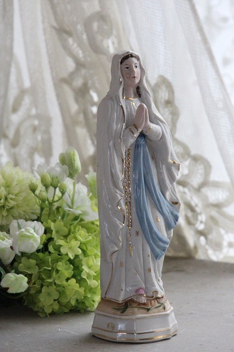 空を見上げ、祈りを捧げる尊いお姿は愛と光そのもの。。。 美しい佇まいの磁器で作られたルルドの聖母像です。 ローブに描かれた星はまるで夜空から降り注いだかのように燦然と輝いています。 手にかけた長いゴールドのロザリオとたなびくブルーの帯。 足元には小さな薔薇の花が置かれています。 これらは全て手彩色となります。 ヒビや欠けなどは無く、全体に良いコンディションです。