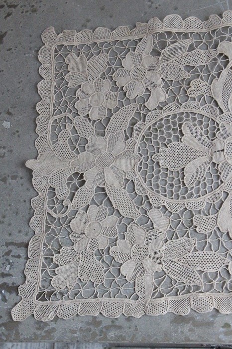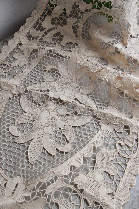 大輪のお花模様の輪郭を何度も巻きかがり、独特の強いラインで表現されたポワン・ド・ヴニーズの