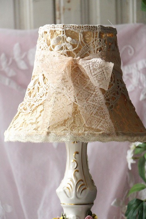 オリジナルのレースのシェードの上に新たに古いレースを重ねてリメイクしたものとなります。
