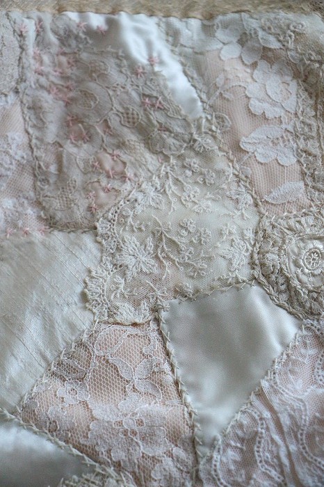 上品で優しいペイルカラーのベビーキルトです。 沢山の繊細なレースがパッチワークされ、 その接ぎ合された上には細やかなステッチが施されたクレージーキルトのベビーキルトです。 裏側はふっくらとした軽やかな綿入りのお布団になっています。 ドールやベアちゃんのお布団にピッタリです♪ 壁に掛けても可愛いですよ♪ まるで未使用品のようにクリーンなコンディションです。