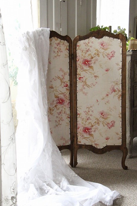 フローラルのアンティークファブリックが貼り込まれた 美しいロココデザインの木製のパラベントです。 温もりが漂う木のフレームには可愛らしいお花の彫刻が施されています。 ファブリックは後年張り替えられたものとなりますが、 木製フレームもファブリックも1900年代初頭頃のフランス製です。 シャビーシックで美しい佇まいのパラベントです。 接続された2枚のパネルの蝶番の状態も良く、とてもしっかりとしています。 お部屋のアクセントにお薦めです。