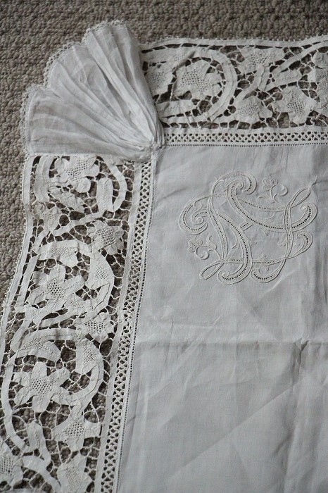 光沢のあるサラッとした高級リネンにボビンレースの縁飾りが施された贅沢なリネンクロスです。
