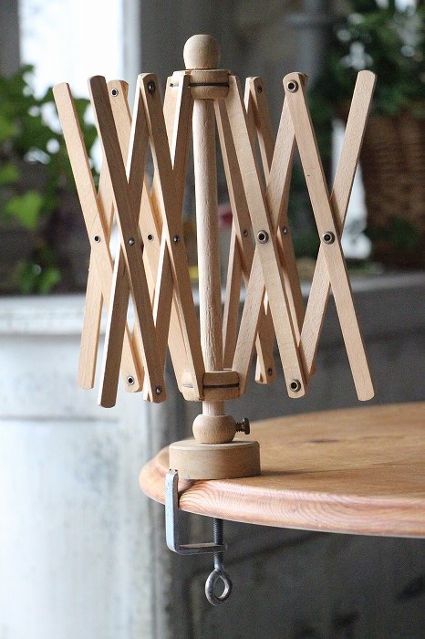 1950年代フランス製 毛糸を巻いたり麻糸を巻いたり、自在に巻のサイズが変えられる卓上用の糸巻き器です。 最大幅はなんと71p 天板の厚みも4pまでが挟み込めますので、比較的どのようなテーブルでもお使い頂けます。 ネックレスや帽子を引っ掛けたり。。。ディスプレーにもお薦めの木製の糸巻きです。 ベストコンディションです。