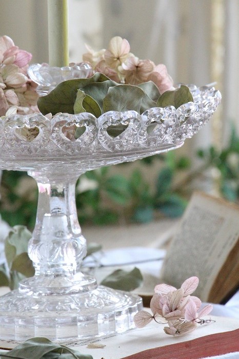 クッキーやケーキ、ショコラなど甘いお菓子にピッタリの とても素敵なガラスのケーキスタンドです。 ハートのくり抜きが可愛らしいエッジと足元の美しいディテールにご注目下さい。 また、プレート部分やスタンドには繊細なアラベスク模様が施されています。 甘いものだけでは無く、雑貨やジュエリーなどのディスプレー用のスタンドにもお薦めです。 ヒビや欠けなどは無く、とても美しいコンディションです。
