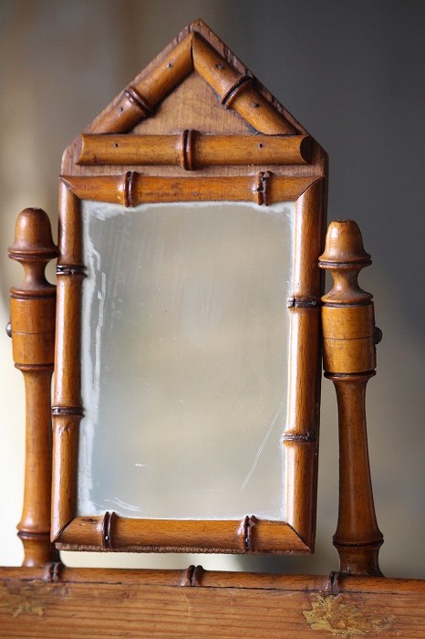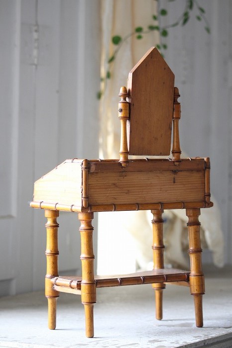 こちらはドール用の家具として作られたドレッサーとなります。 ドール用とし言いましても、決して小さくは無いサイズ感です。 艶やかでまるで本物のバンブーのような木彫りの装飾が全体に施され、 天板には本物の大理石が置かれています。 随所に意匠性を盛り込んだ贅沢に作られた家具です。 ミラーは前後にスウィングします。 ミラーの縁周りに白い汚れが見られますが、拭いたら綺麗にとれましたのでご安心下さい。 また、ミラーには腐食などは無く概ね良いコンディションです。