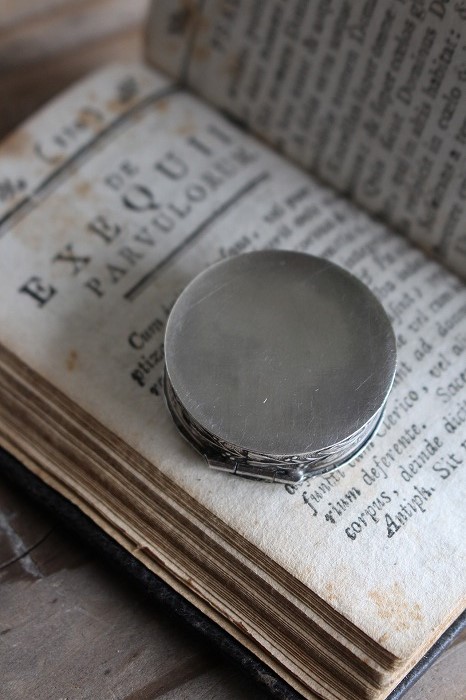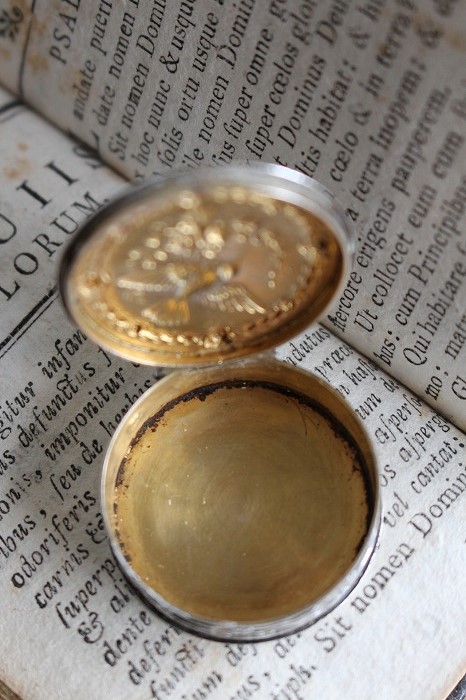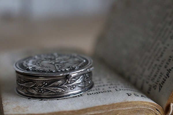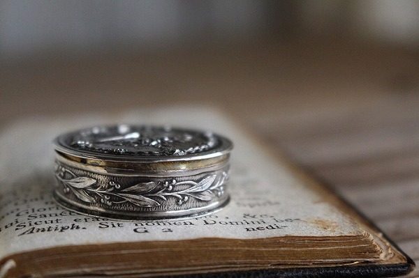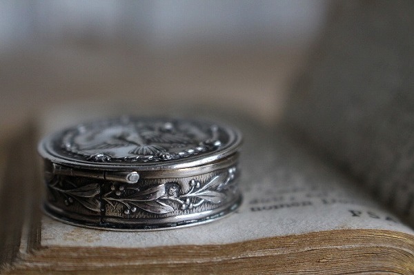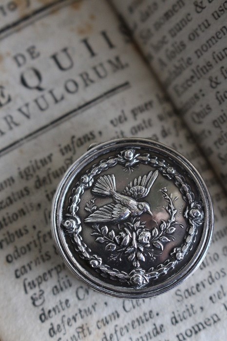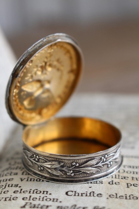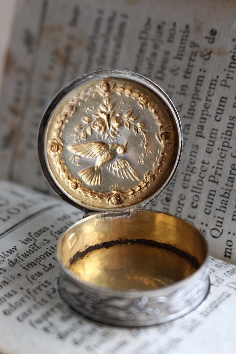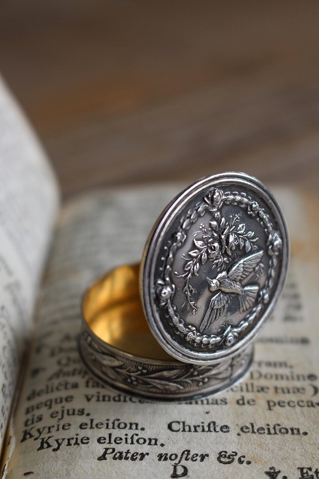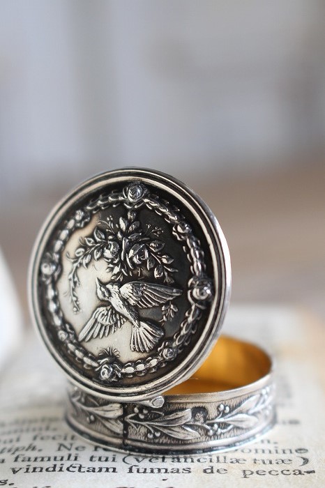 1880-1900 フランスアンティーク 繊細で美しい薔薇のスワッグと鳩の打出し模様が施された小さな銀の小箱です。(12.4グラム) 側面にも繊細なローレルの葉のエンボス模様が施されています。 ローレルの葉の上に、良く見るとフレンチシルバーの刻印があります。 また、蓋を開けると内側に施されたヴェルメイユのゴールドに目を奪われます。 底の縁周りにわずかに変色が見られますが、全体的に小傷なども少なく、綺麗なコンディションです。 蓋の開閉も大変スムーズです。
