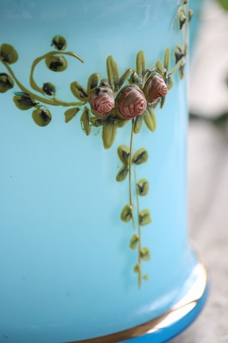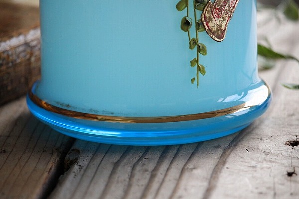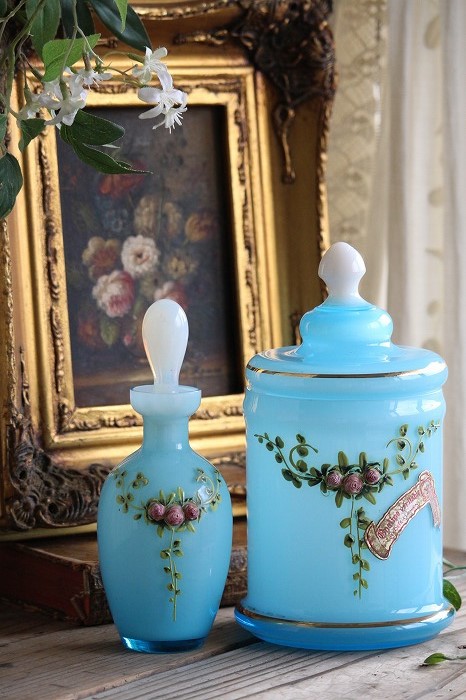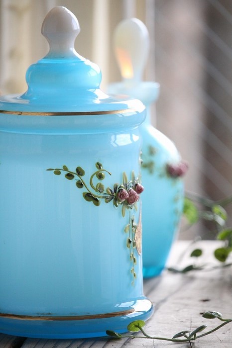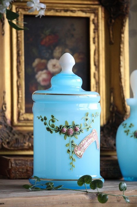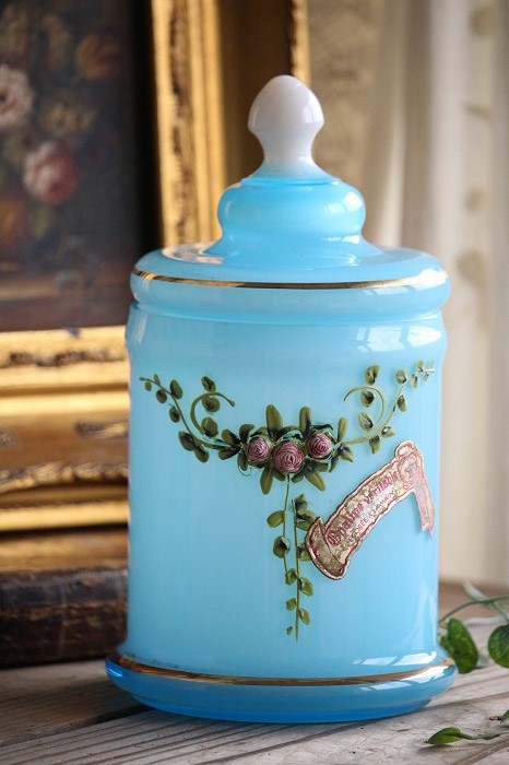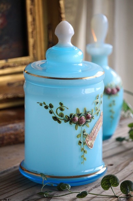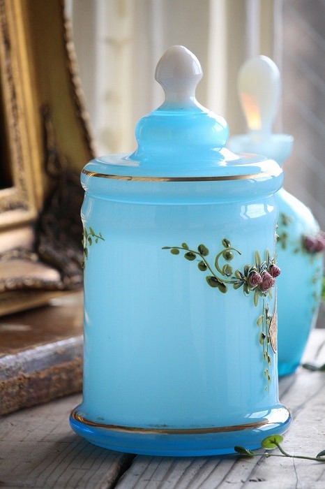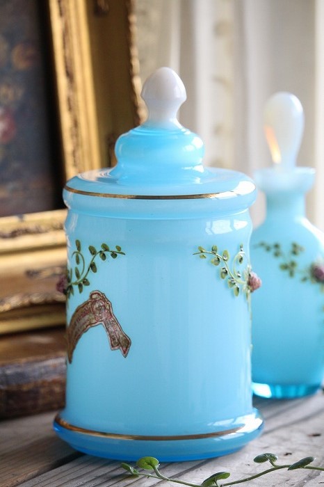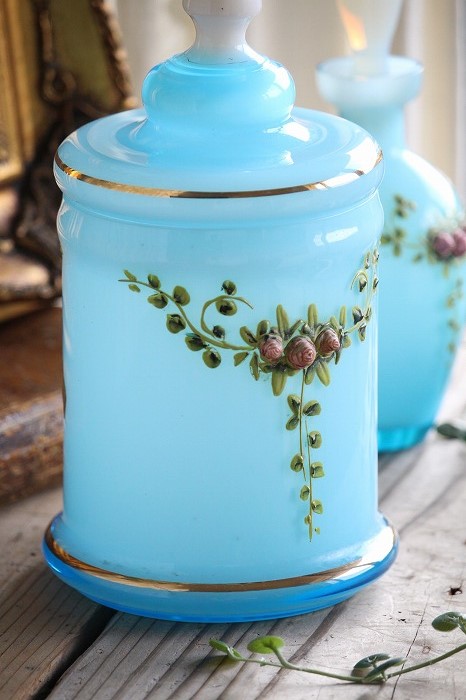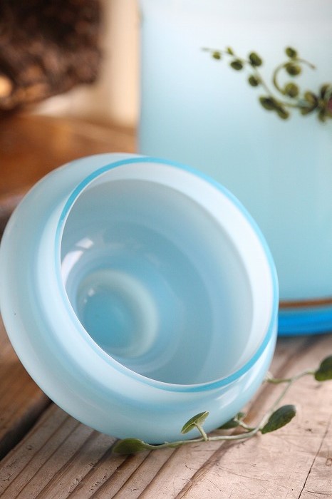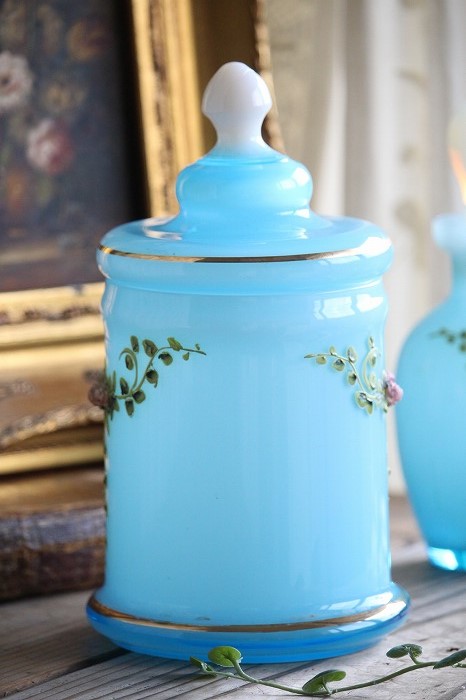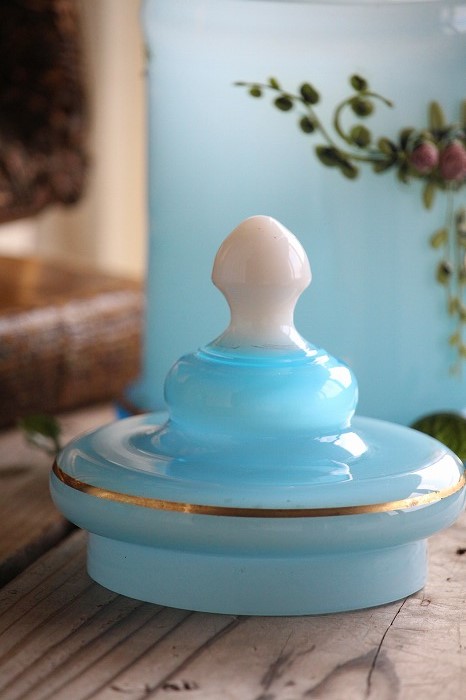 蓋のホワイトオパーリンガラスの摘みも可愛らしいですね。