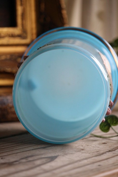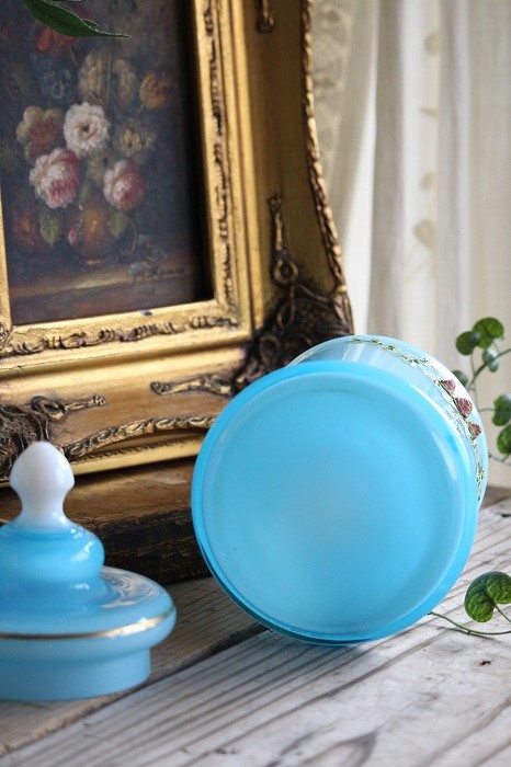 発色が美しいオパーリンブルーのガラスのバニティーポットもしくはボンボニエールです。