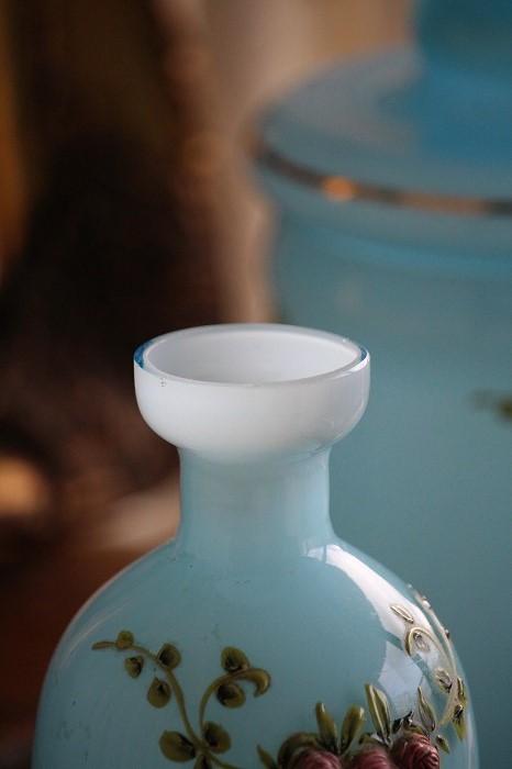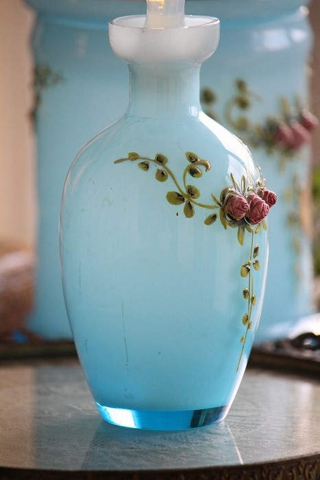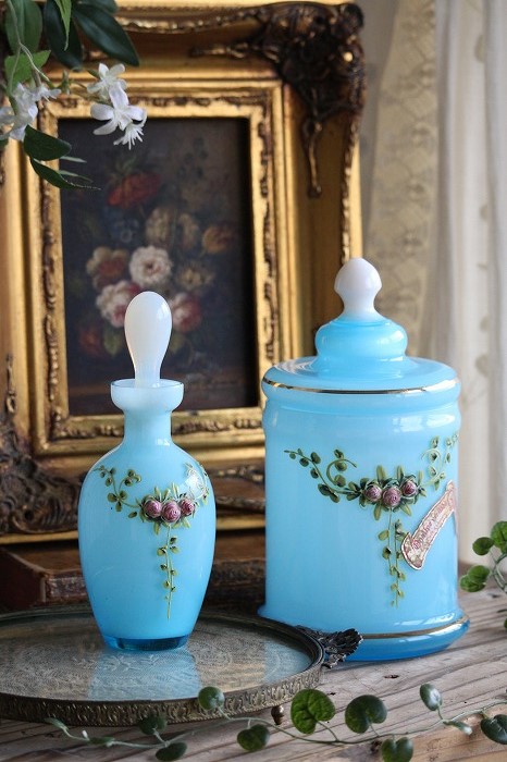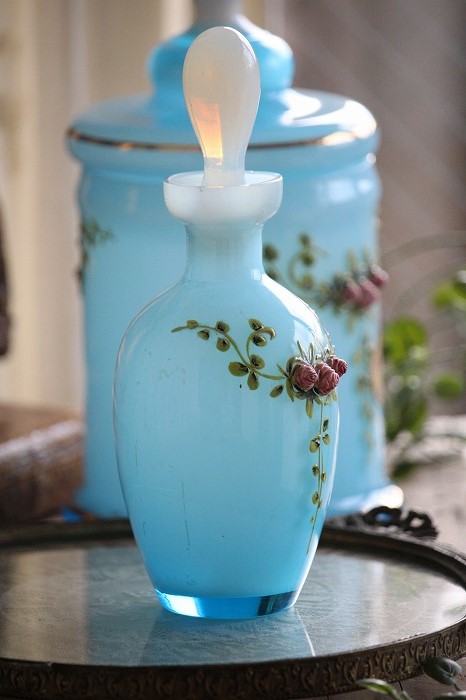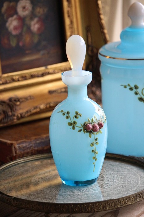 ボトルには、立体的な薔薇と手書による葉のガーランドのエナメル絵付けが施されています。