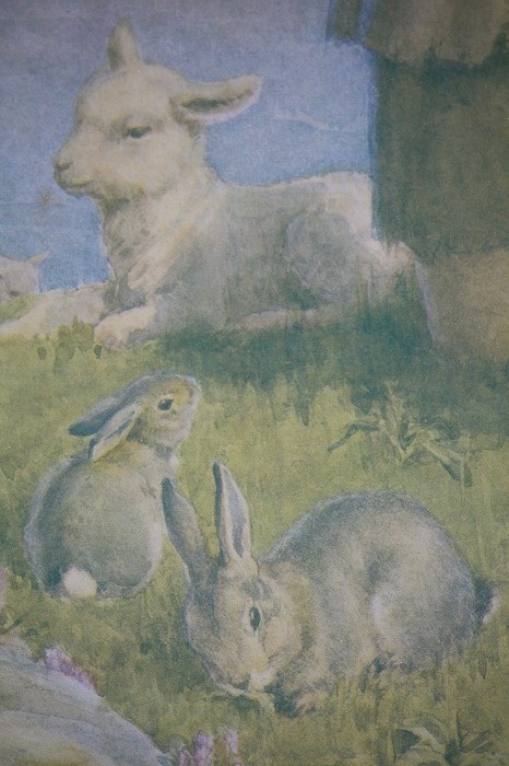 少年を優しい眼差しで見上げる子羊やウサギ、アカリスのなんと可愛らしいこと。。。。。