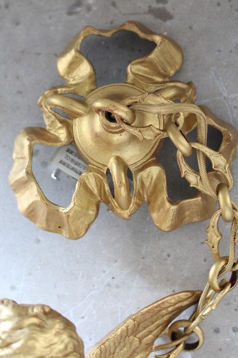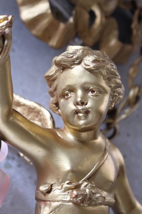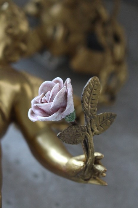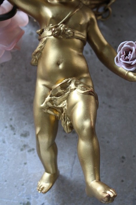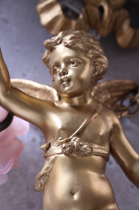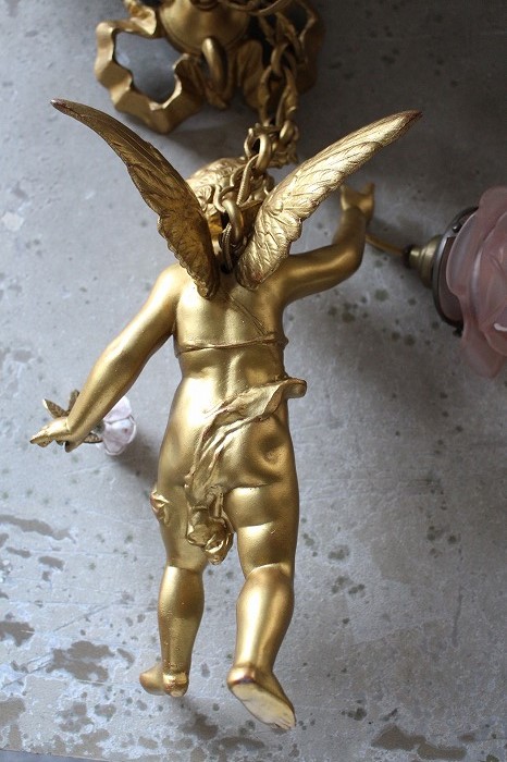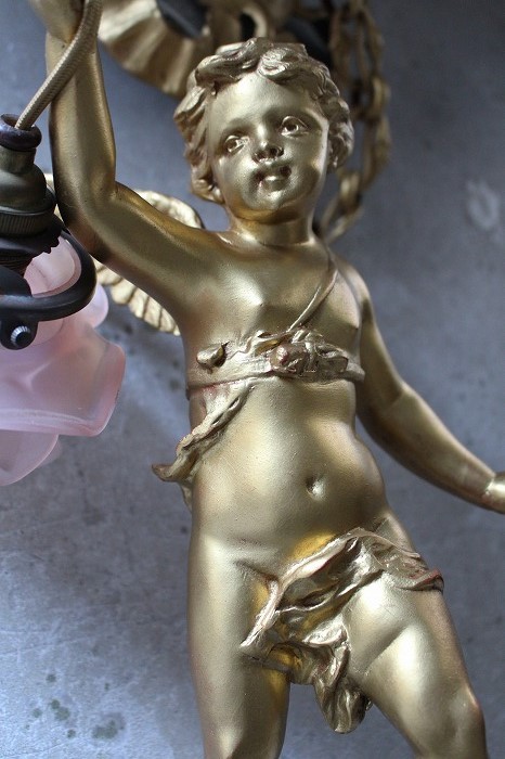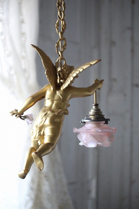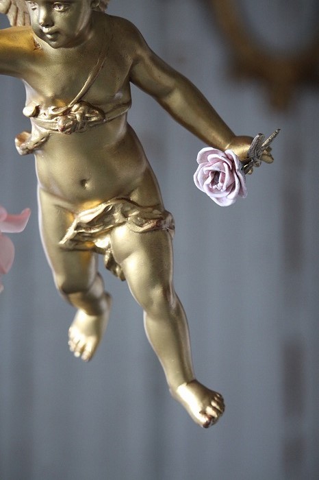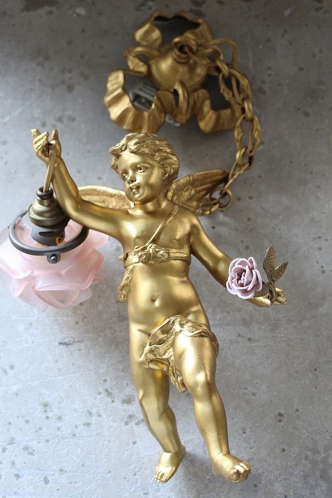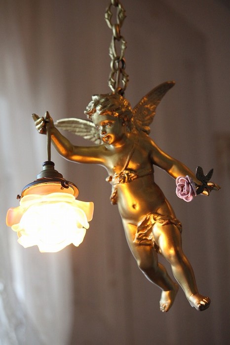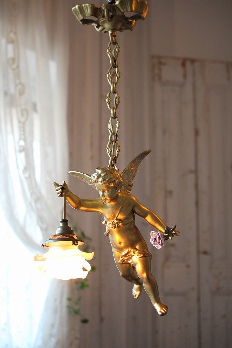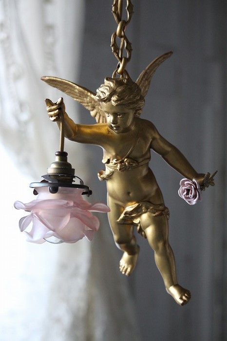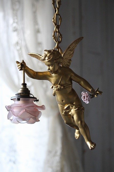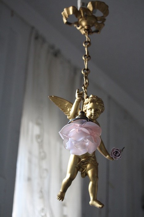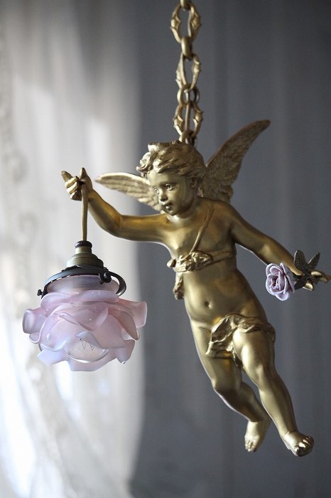 一輪の磁器の薔薇を持った、可愛らしいお顔の天使の吊り下げランプです。