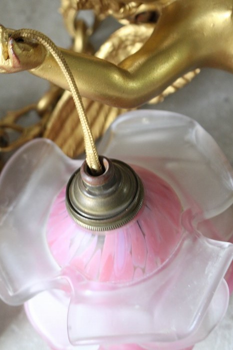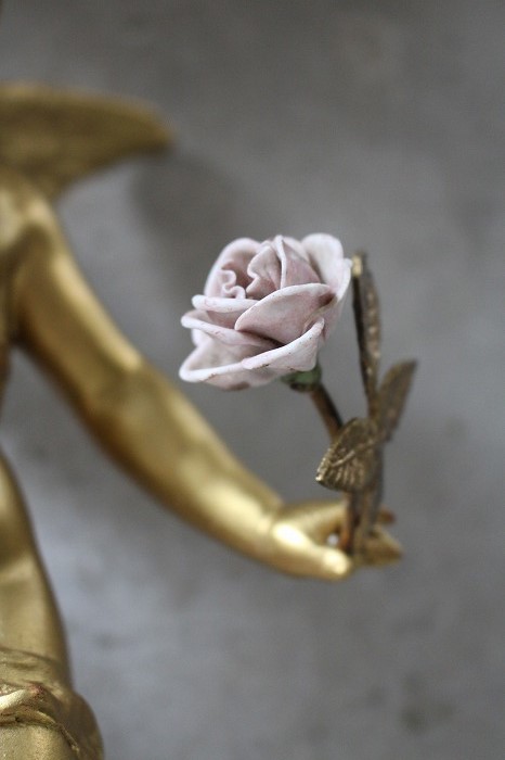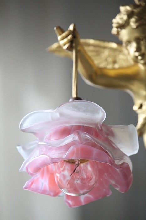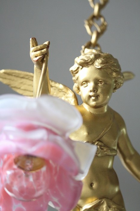 ピンク色の一輪の磁器の薔薇を持った、ハンサムな天使の吊り下げランプです。