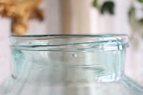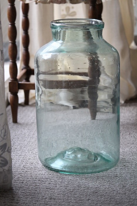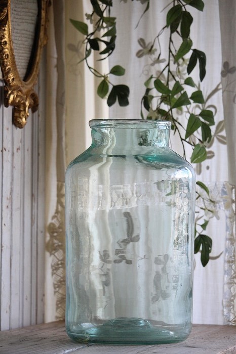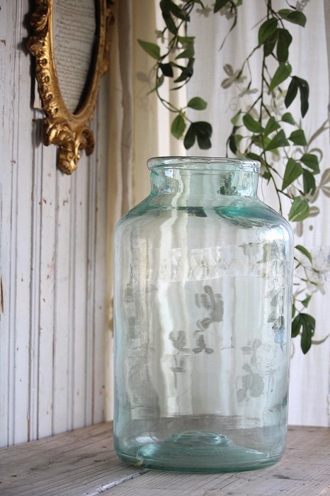 グリーン色の大きなガラス瓶です。 カフェや雑貨屋さんで見かける大きな雲竜柳などの植物を生けたり、 小物入れにしたりと、使い勝手の良いサイズ感です。 口周りが広いのも便利です。 製造時からのガラスの筋や気泡などがみられます。 目立つヒビや欠けなどは無く、全体に良いコンディションです。 便のか中はほこりなどの汚れが見られますので洗ってからお使い下さい。
