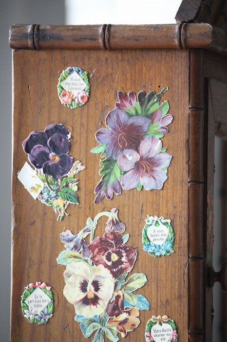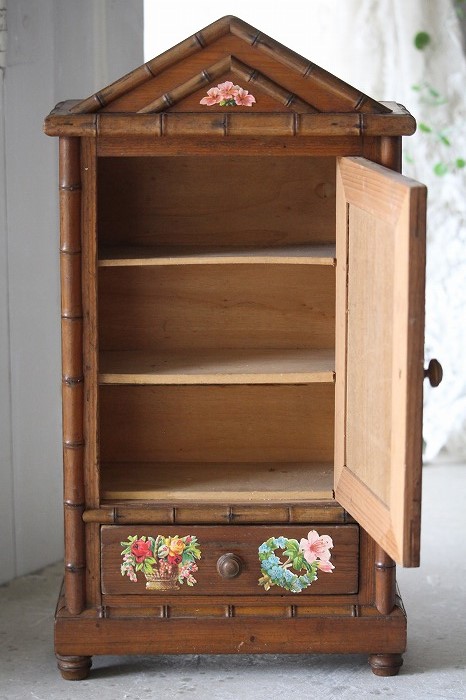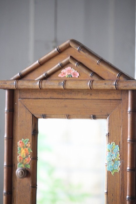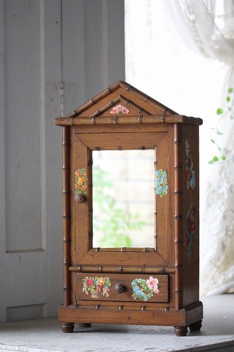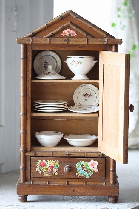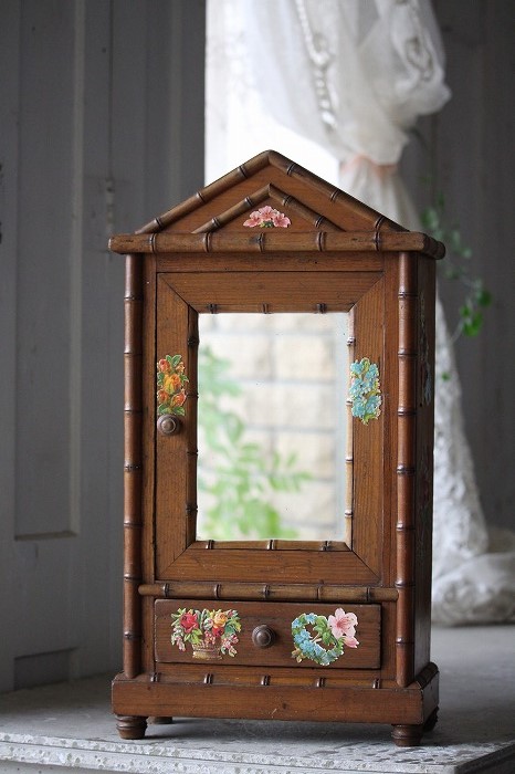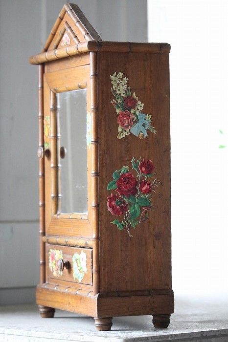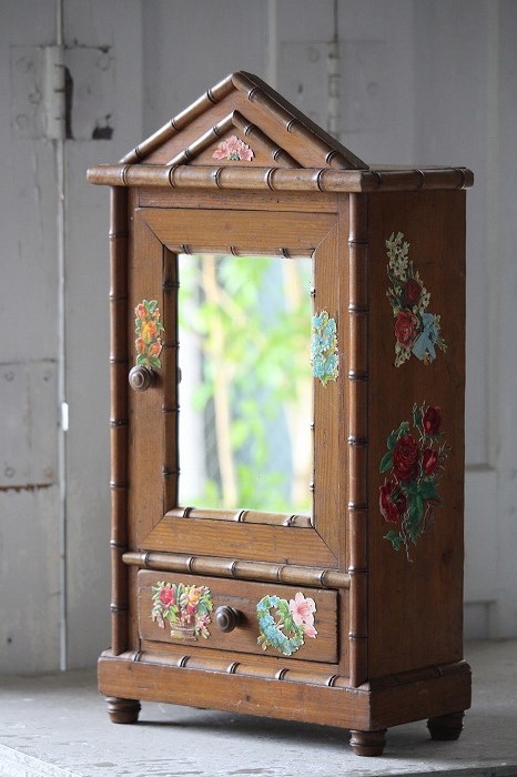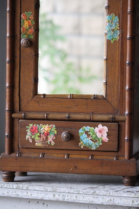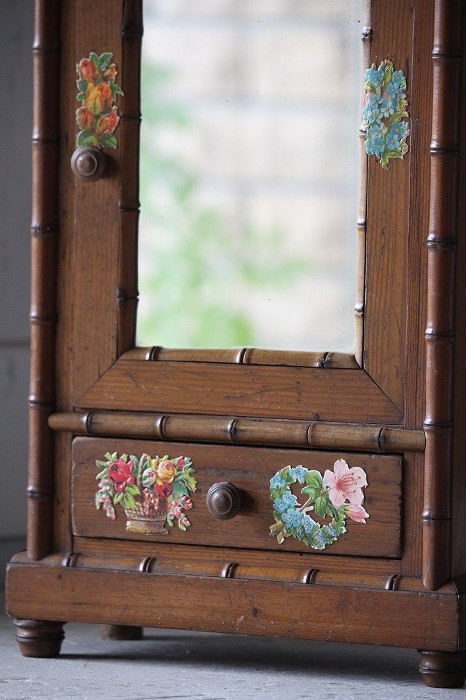 バンブーとパイン材で丁寧に作られたドール用の古いドレッサーです。 ガタ付や、歪みなどは無く、ドアの開閉もスムーズ。 全体的に良好な状態です。 オリジナルミラーに歪みなどは無く、古いものとしては、とても良いコンディションです。 また、全体に貼られた古いクロモスにより、唯一無二の存在感を漂わせています。 脚は4つ。一つだけ同サイズの別のものと交換されています。 それにより、傾きなどは全くありません。 コレクターズアイテムとなります。 このサイズ感は希少です。