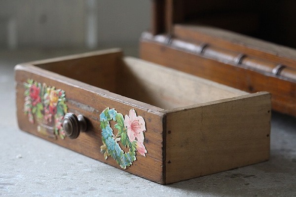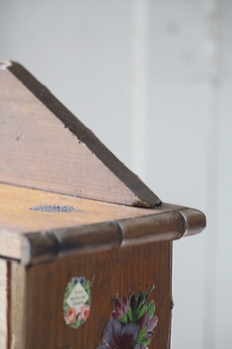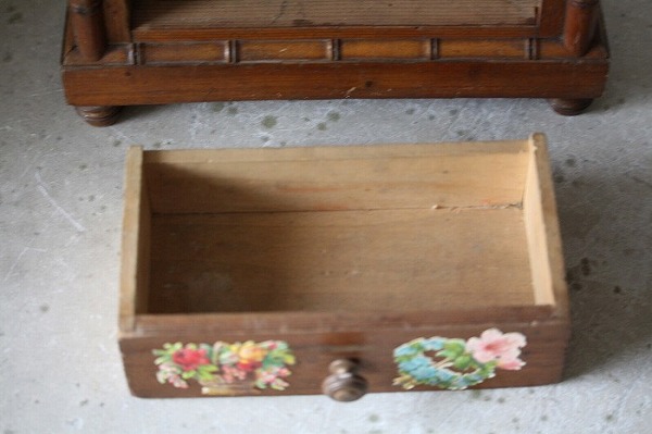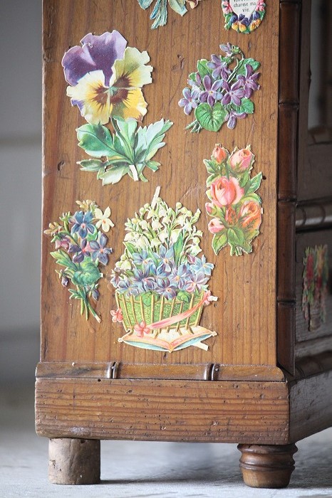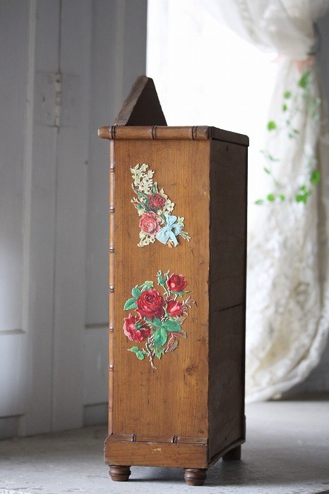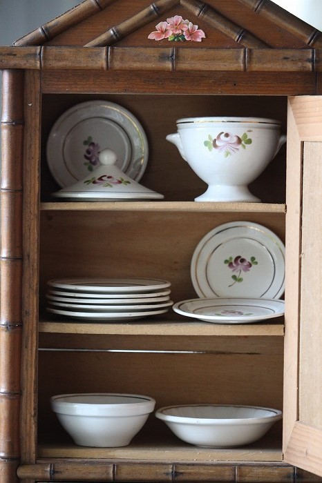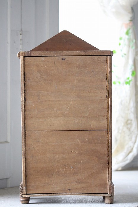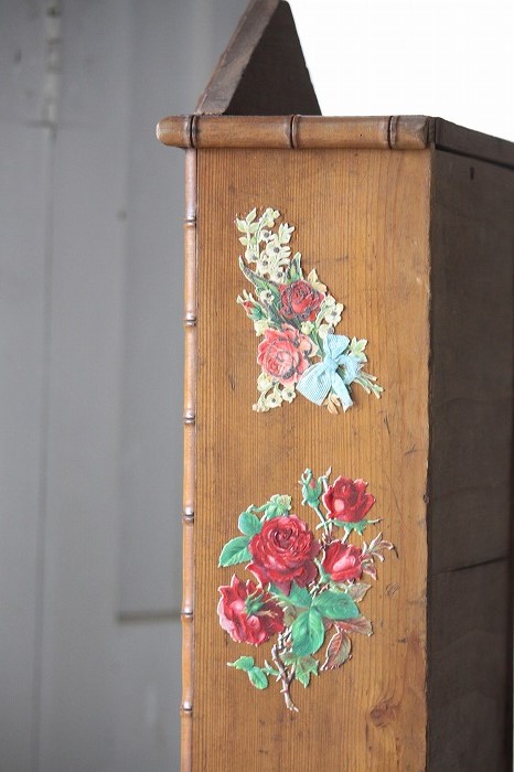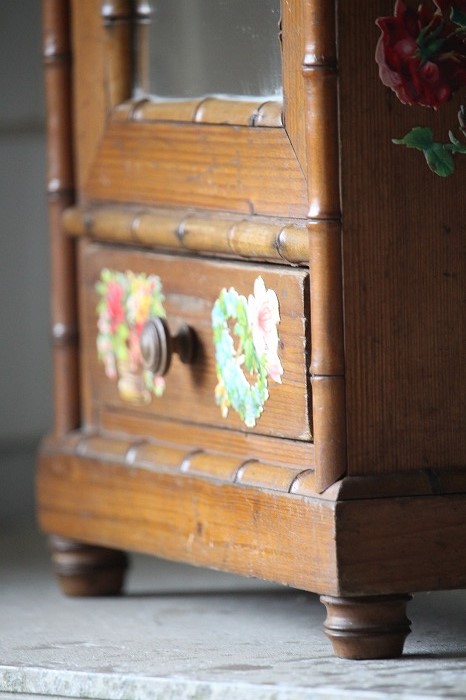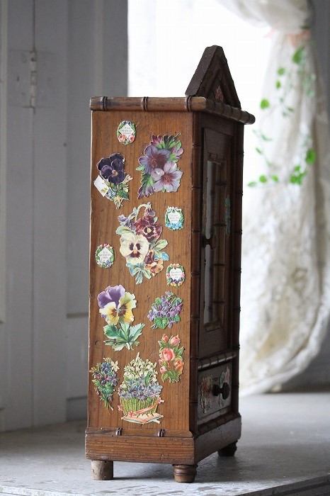 バンブーとパイン材で丁寧に作られたドール用の古いドレッサーです。 ガタ付や、歪みなどは無く、ドアの開閉もスムーズ。 全体的に良好な状態です。 オリジナルミラーに歪みなどは無く、古いものとしては、とても良いコンディションです。 また、全体に貼られた古いクロモスにより、唯一無二の存在感を漂わせています。 脚は4つ。一つだけ同サイズの別のものと交換されています。 それにより、傾きなどは全くありません。 コレクターズアイテムとなります。 このサイズ感は希少です。