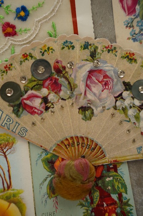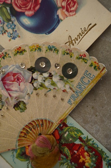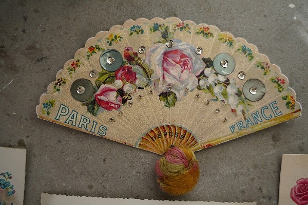 とても可愛らしいパウダーの広告用扇型カードです。 1940年頃のフランスアンティークとなります。 オリジナルの古いスパンコールやらガラスビーズやらシルクのボンボンが設置されています。 こちらは現在単品で6,800円で販売しておりますが、 他のカードをセットにして更にお求めやすい価格にて販売いたしました レースに刺繍が施されたカードも可愛いです. 是非ゴレクションに加えて下さい