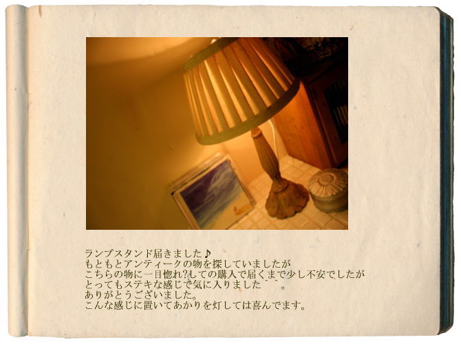 2011年11月11日(金曜日) 先日,アイボリープリーツシェード付きランプスタンドをご購入下さったN様より素敵なお写真とコメントが届きました♪ ------------------------------------------------------------------------------------